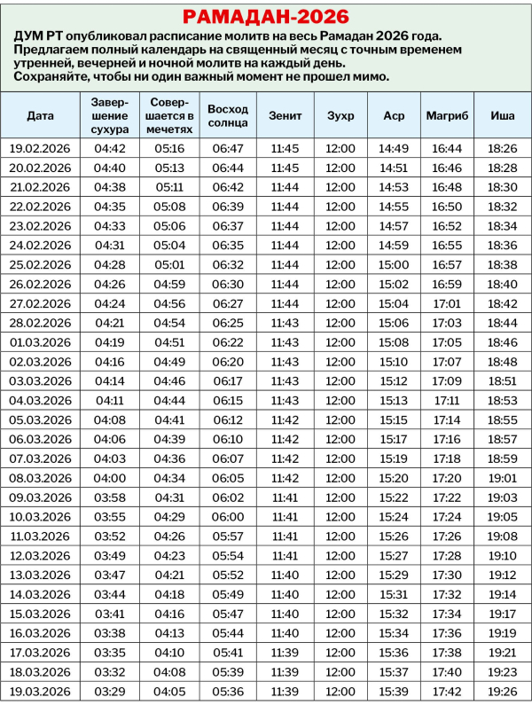 Духовное управление мусульман Татарстана опубликовало расписание молитв в период Рамадана в 2026 году.