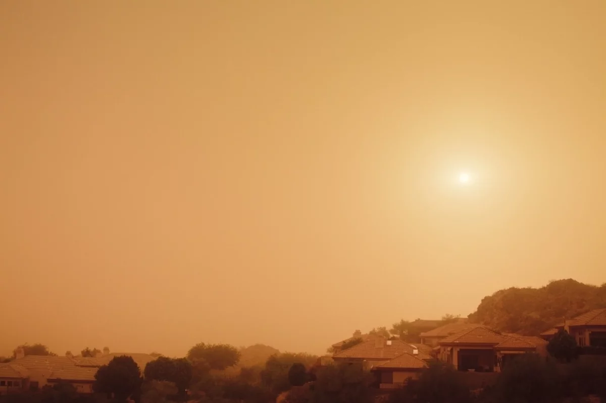 Отмечается, что небо приобрело неожиданный красно-оранжевый оттенок из-за изменения преломления солнечного света частицами пыли.