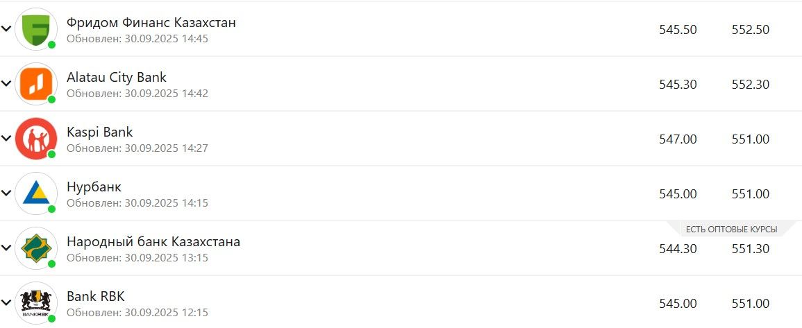 В обменных пунктах Атырау 30 сентября доллар США продают по 551–552 тенге, что выше официального курса Национального банка — 548,79 тенге.