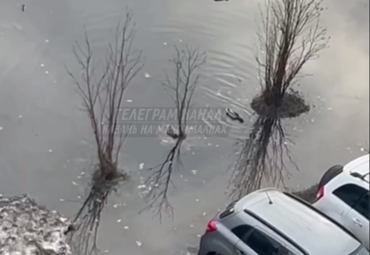 Фокус в том, что никакого пруда там на самом деле никогда не было, зато есть огромная лужа, образовавшаяся из-за таяния снега и покрывшая добрую половину просторной детской площадки.