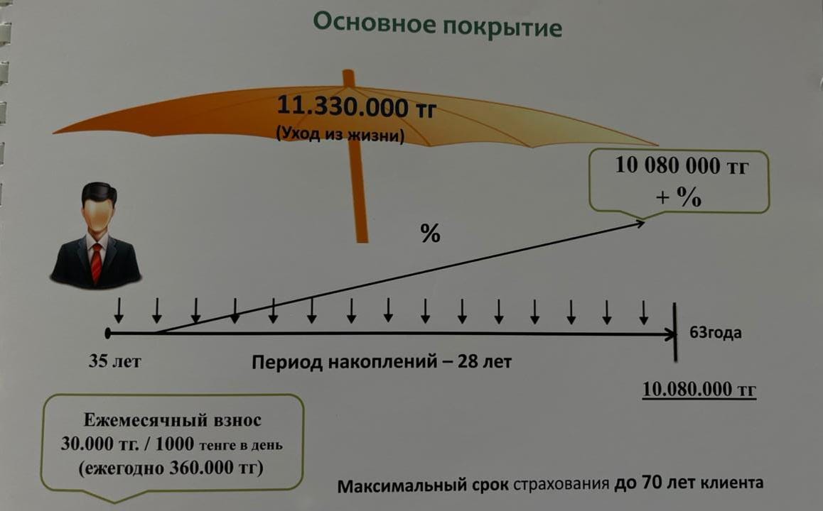 Пример прост: если клиент в 35 лет начинает откладывать по 30 тыс. тенге в месяц (примерно 1 тыс. в день), то к 63 годам он накопит свыше 10 млн тенге собственных средств. Прибавив инвестиционный доход, сумма превысит 11 млн тенге. При этом всё время действия полиса семья застрахована на сумму 11,3 млн тенге, а в случае несчастного случая — на 22,6 млн тенге.