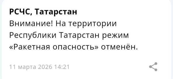 Как отмечала пресс-служба Раиса РТ, меры безопасности во время ракетной опасности сопоставимы с действиями, которые необходимо предпринимать при угрозе атаки беспилотников. Ранее этот режим уже дважды вводился в республике: 27 февраля и 3 марта.