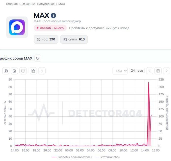 Сегодня в России произошел сбой в работе национального мессенджера MAX. Пользователи жалуются, что не загружаются сообщения и фотографии, а также не приходят уведомления. О наличии проблем в работе мессенджера MAX сообщает сервис Detector.