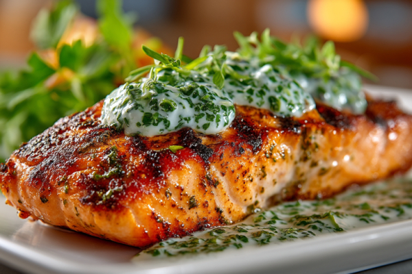 Сочетание горячего, пропитанного дымком стейка лосося и прохладного травяного соуса — это гастрономический дуэт, который впечатляет своей гармонией.