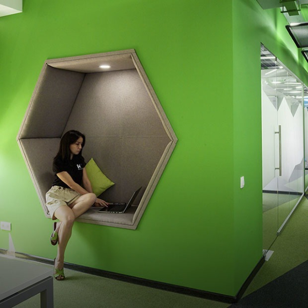 Преимущества офиса — комфорт, зонирование пространства и много свободного места. Пространство хорошо оборудовано технически, вплоть до розеток в столах и в полу, чтобы не спотыкаться об удлинители. Повсюду стоят пуфики, пол выстлан мягким ковроланом, в стенах — мягкие ниши.