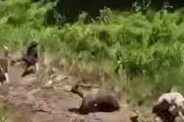 На кадрах видно и слышно, как мужчина с криками и свистом под лай собак, взмахивая палкой, направляется в сторону медведя, уже схватившего одного из баранов. Через секунды после появления в кадре медведь, не без помощи собак, отпускает свою жертву, затем пытается то вновь ухватить парнокопытное, то отбиться от псов. В итоге хищник все же убегает обратно в лес.