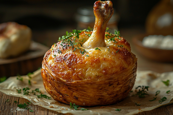 Лукошки с курицей — сытное угощение, которое покорит ваших гостей. Куриные голени предварительно обжаривают, слегка запекают, затем оборачивают слоеным тестом и снова отправляют в духовку. Для сочности на тесто сначала выкладывают тушеный шпинат, а потом уже голень.