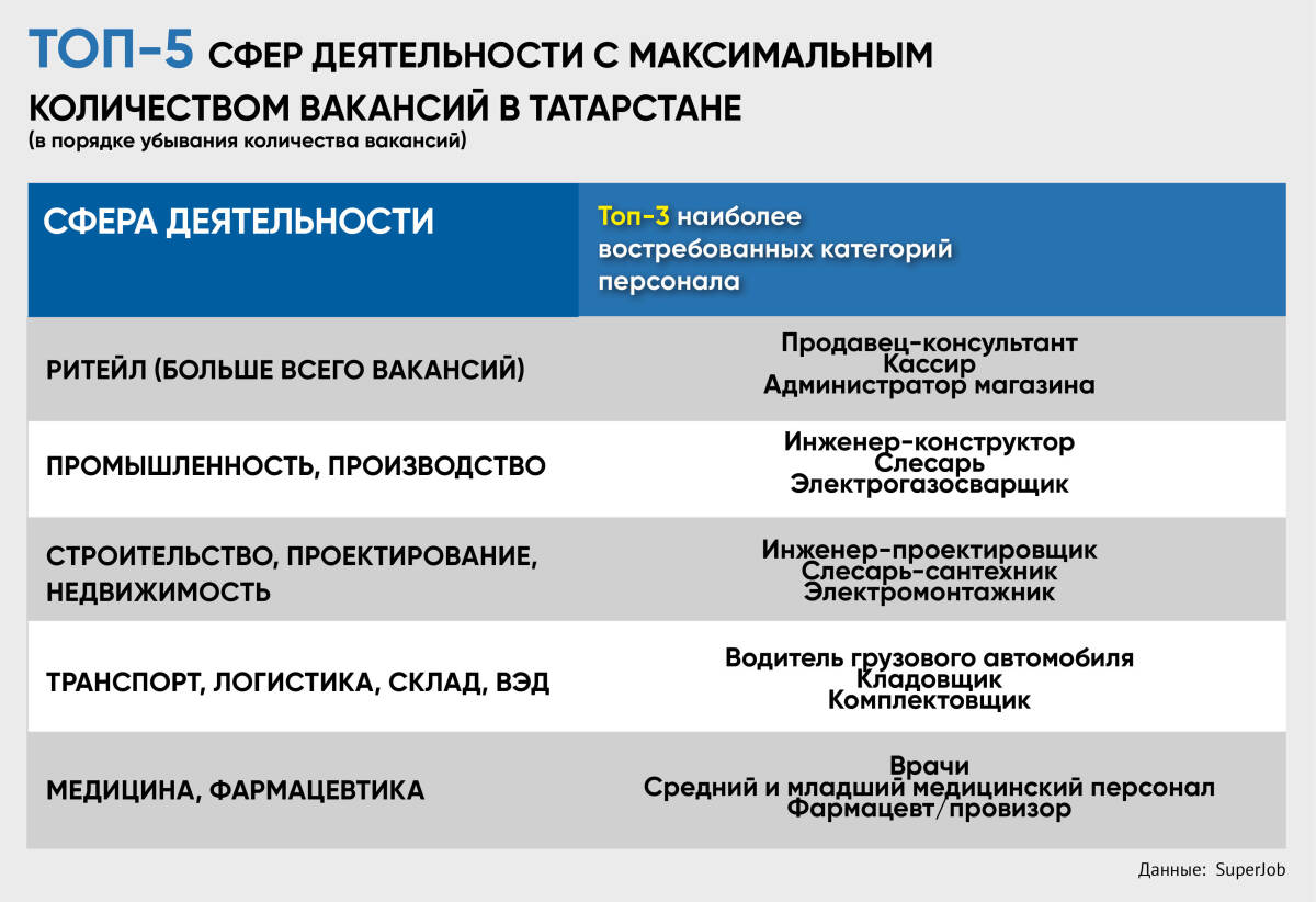 «Бесспорный лидер по кадровой потребности – строительство. Отрасль заявила 30,7 тыс. рабочих мест, или 59% от общего числа вакансий республики. Далее следует промышленность с показателем 8,4 тыс. вакансий (16%). В тройку самых востребованных входят образование и наука, где требуется 3 тыс. (6%) специалистов», – отметили в пресс-службе ЦЗН РТ.