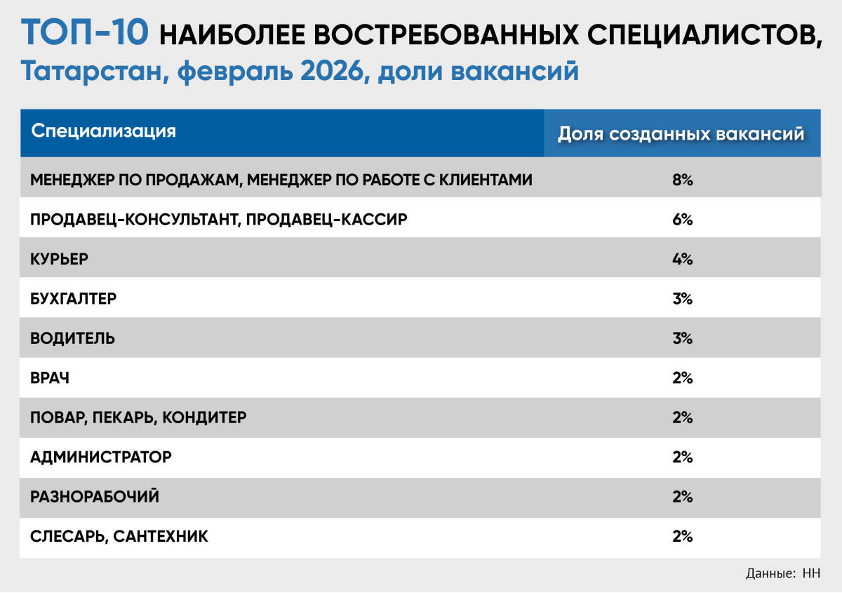 На hh.ru в месяц в Татарстане наиболее востребованными стали менеджеры по продажам, на долю которых приходится 8% от общего числа вакансий. На втором месте продавцы-консультанты и продавцы-кассиры (6%), на третьем – курьеры (4%).